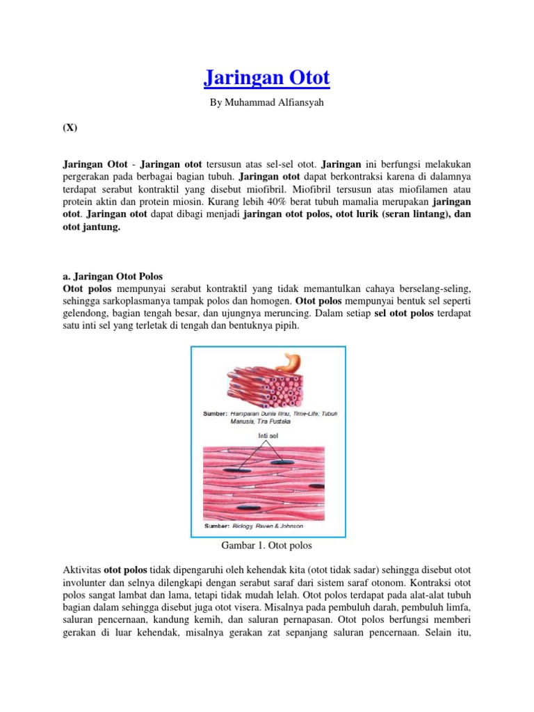 Berdasarkan lokasinya, jaringan meristem terdiri dari 3 jenis. Gerak merupakan suatu hasil kerja dua komponen, yaitu tulang dan otot. Cara kerja otot polos yaitu berkontraksi secara refleks dibawah pengaruh saraf otonom dan bila otot polos dirangsang reaksinya lambat dan tidak mudah lelah. Gerak terjadi karena kanisme kontraksi serat kontraktil. Jaringan otot adalah kumpulan sel otot. Jaringan otot memiliki empat sifat utama: Jaringan otot dibagi menjadi 3 yaitu Fungsi jaringan otot manusia sangatlah penting untuk tubuh. Otot polos otot lurik otot jantung. Berdasrakan morfologi dan fungsinya, jaringan otot pada manusia dibagi menjadi tiga bagian yaitu otot polos, otot lurik, dan otot jantung. Eksitabilitas (kemampuan untuk menanggapi rangsangan), kontraksibilitas (kemampuan berkontraksi), ekstensibilitas (kemampuan untuk ditarik tanpa robek) dan elastisitas (kemampuan untuk kembali ke bentuk normal). Jaringan embrional, adalah jaringan dari hasil pembelahan sel zigot. Berdasarkan ciri khasnya, jaringan otot dibagi menjadi tiga, yaitu